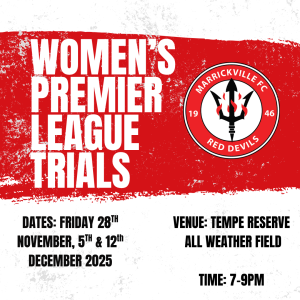 Marrickville Football Club is proud to announce trials for our Women’s Premier League team! Whether you’ve grown up playing in Marrickville or are new to the area, this is your chance to be part of our vibrant football community at the top competitive level. Trial Dates: Friday 28th November, 5th & 12th December 2025Location: Tempe…
