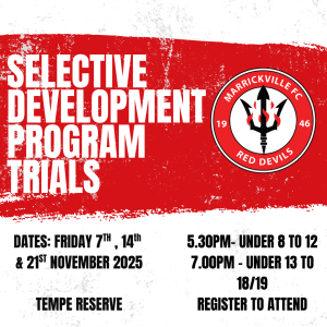 Are you ready to take your football to the next level?Marrickville FC is holding trials for our Selective Development Program (SDP) — a high-performance training and competition pathway for motivated players who want to challenge themselves and develop under experienced licensed coaches. Trial Dates: November 7th, 14th & 21st U8 – U12 5:30 – 6:30,…